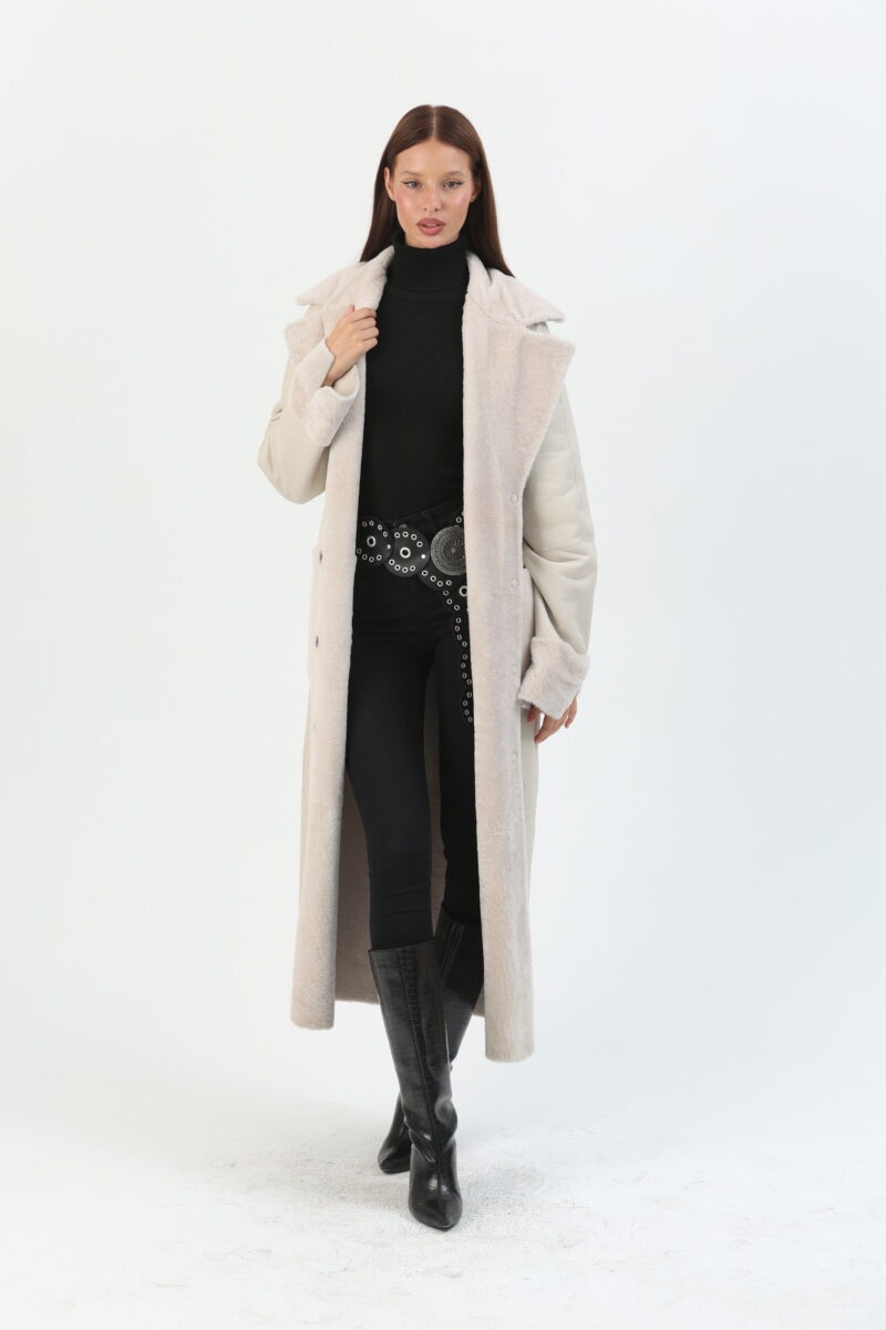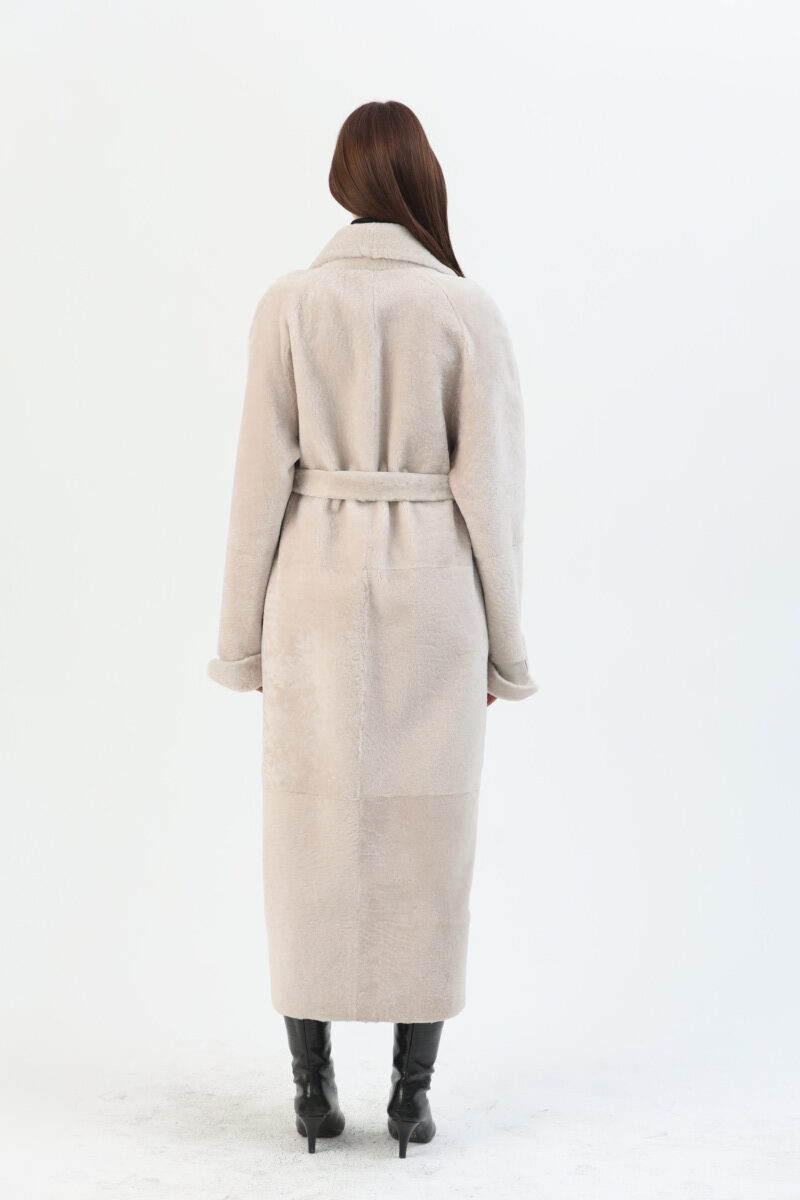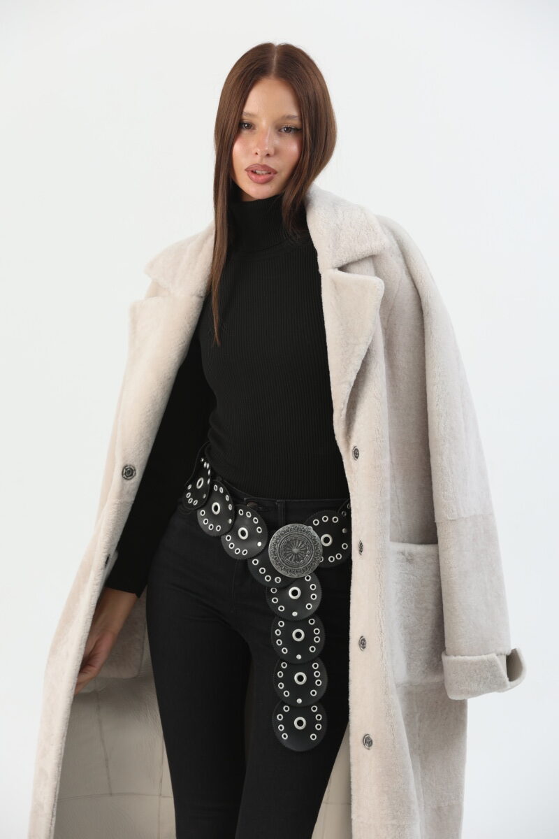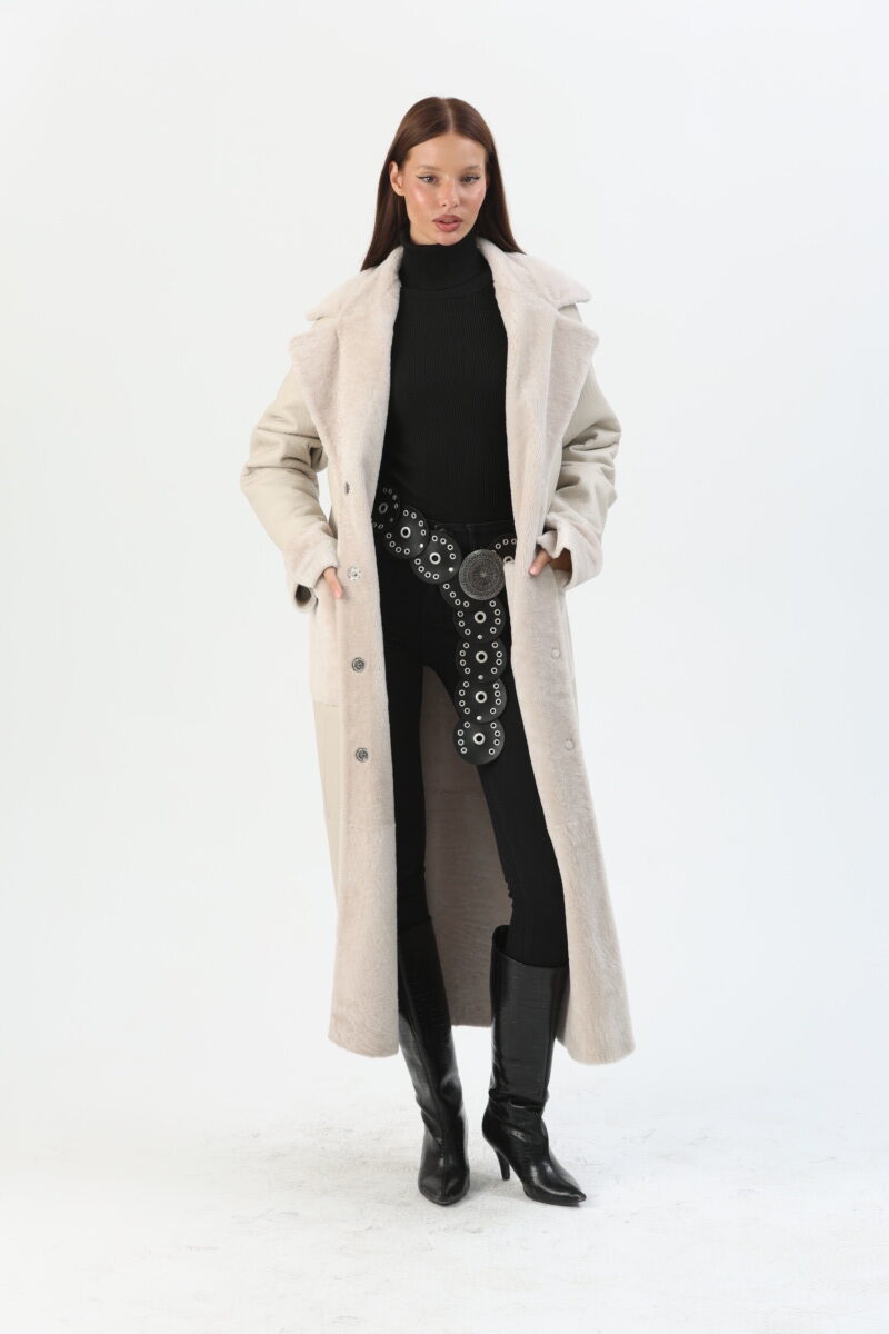 Snap-Button Belted Sheepskin Long Coat